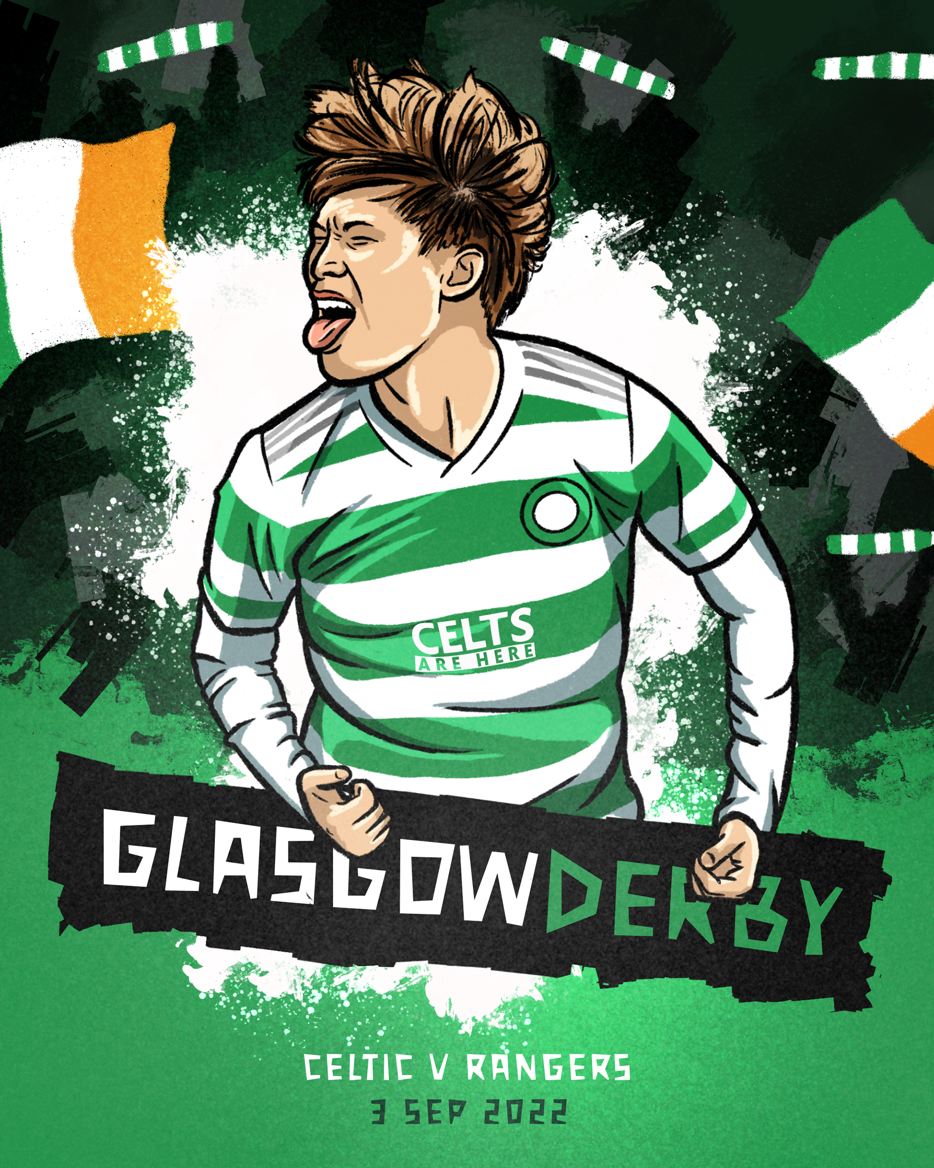Celtic FC fanpage CeltsAreHere asked me to make matchday illustrations for the Celtic derby matches vs Rangers during the 2022-23 season. They provided me with a brief before each match, which I used to create a fitting illustration.